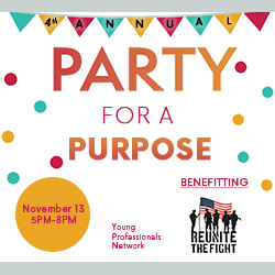 Connect with like-minded professionals, grow your network, and make a meaningful impact at our YPN’s upcoming event, Party for a Purpose, benefiting Reunite The Fight — a veteran-owned and operated non-profit dedicated to providing vital support to veterans struggling with PTSD, survivor’s guilt, depression, and other service-related traumas.